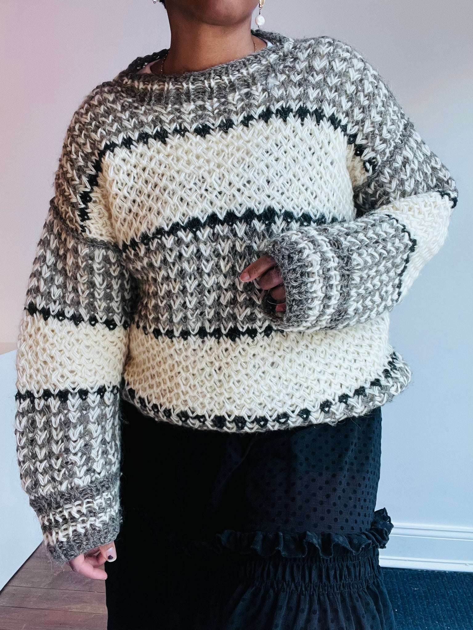 Double knit handmade wool ski sweater with grey, black and cream striped pattern