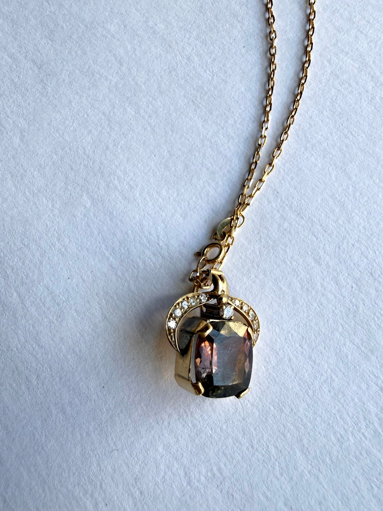 VINTAGE GOLD PENDANT NECKLACE WITH SMOKY TOPAZ QUARTZ STONE AND DIAMONDS